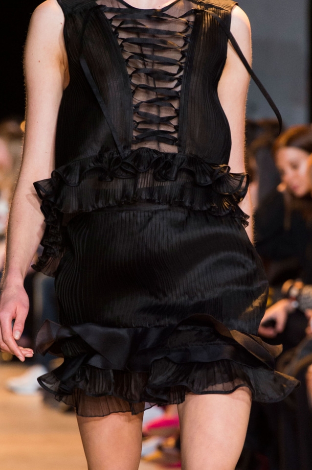 Пиратам достаются роскошные ботфорты и брюки совершенно нового силуэта, впервые представленные француженкой именно в осенне-зимнем сезоне — с не просто высокой, а очень высокой талией, обтягивающие и узкие, как легинсы. Отсылают к образу морского волка, задокументированному не одним кинофильмом, и пуговицы с капитанских мундиров, в качестве декоративных элементов разбросанные по юбкам, и сами плечистые жакеты. А белые оборки и полупрозрачные воланы, скрепленные корсетными шнуровками, напоминают одновременно и о белоснежных распахнутых на груди рубашках самих пиратов (разумеется, в их киноверсии), и о великосветских дамах, оказавшихся за бортом.