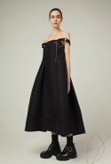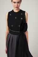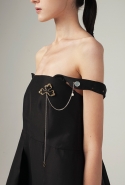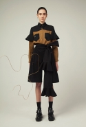 Напоминают об Индии и другие элементы. По словам Жени, именно ее культурой объясняется и цветовая гамма, «заимствованная у индийских специй». А металлическая фурнитура в виде брошей, цепочек и тканевых шнурков, имитирующих металл, по задумке дизайнера напоминает об украшениях индианок. Особенно красиво это выглядит на одном из платьев-сарафанов с приспущенными с плеч лямками. Тонкая цепочка соединяет аккуратное украшение на плече с крупной брошью, прикрепленной на грудь, а ее хвост с колечком на конце, покачиваясь, свободно спускается вниз. И это действительно напоминает легкие и необычные украшения, которые цепляются за мочку уха и тянутся до крыла носа, что выглядит довольно необычно и на лицах, а в качестве декоративного элемента на одежде становится и вовсе неожиданностью. Интересными кажутся и глухие темные юбки из довольно плотной и грубой ткани, усеянные крохотными мерцающими цветами, похожими на сережки-гвоздики.