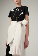 Ну а крупные цветы, аппликации из белых цветов на ломаных зеленых стеблях вдохновлены хрупкими и странными работами американского скульптора Александра Колдера. Его выставка-ретроспектива этим летом проходила в ГМИИ им. Пушкина и, возможно, как раз и повлияла на выбор Жени — все-таки молодые дизайнеры, вероятно, часто работают над коллекциями именно в последний момент.