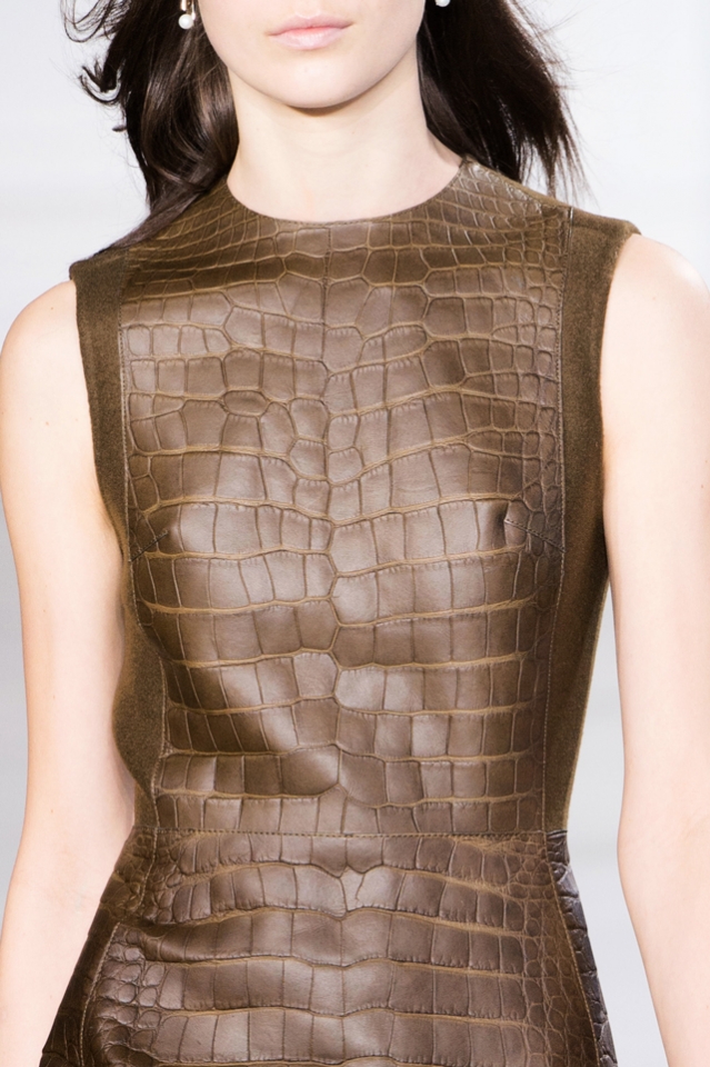 Несмотря на исключительную прагматичность подхода, результат выглядит вполне впечатляюще: обращаясь к американскому стилю и наследию Кельвина Кляйна, Ву создал очень современную и без оговорок удачную коллекцию. Именно так и должен выглядеть условный «повседневный гламур», если дизайнер изначально его заявляет — с равновеликими отсылками и к спортивному минимализму 90-х, и к голливудскому гламуру — уже совершенно традиционному. Основным предметом коллекции стали платья: из кожи, других плотных тканей или, ближе к концу, нежного атласа, с невыраженным акцентом на талии, длинной юбкой ниже колен и обязательным разрезом чуть сбоку, обнажающим ногу до самого бедра. Это не привычное платье-футляр, с которым почему-то в первую очередь соотносится большинство попыток поиграть в «сильных женщин», но куда более живая вещь.