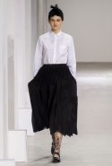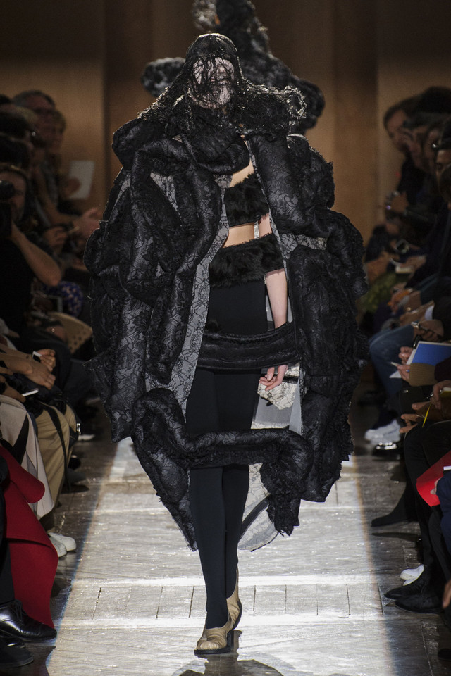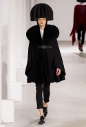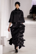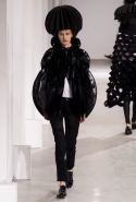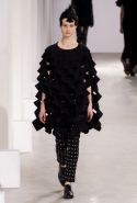 Еще одна совершенно невероятная по работе с объемами и формой коллекция, напоминающая нам о вчерашнем шоу Issey Miyake, сегодня была представлена командой Junya Watanabe. Из самых необычных материалов, от гофрированной объемной сетки до пластов с острыми шипами-пирамидками, словно склеенными старательным художником из бумаги, Ватанабе делает вещи яркие, авангардные и вызывающие искреннее восхищение. Особенно приятно то, что большую часть из них можно даже без особого стеснения носить. Если же юбка-торшер или шипованное пальто вам пока не по зубам, найдутся выдержанные в том же стиле, но куда более жизненные аксессуары: например, шарфы в тех же шипах, которые надеваются поверх простой белой рубашки с черными брюками. Не выглядят клоунскими и яркие вечерние платья (нам пришлось особенно по душе ярко-розовое), и замысловатые пальто, и кейпы невероятных силуэтов. Для реальной жизни вряд ли подойдут разве что головные уборы, некоторые из них и вовсе напоминают гигантские черные подсолнухи.