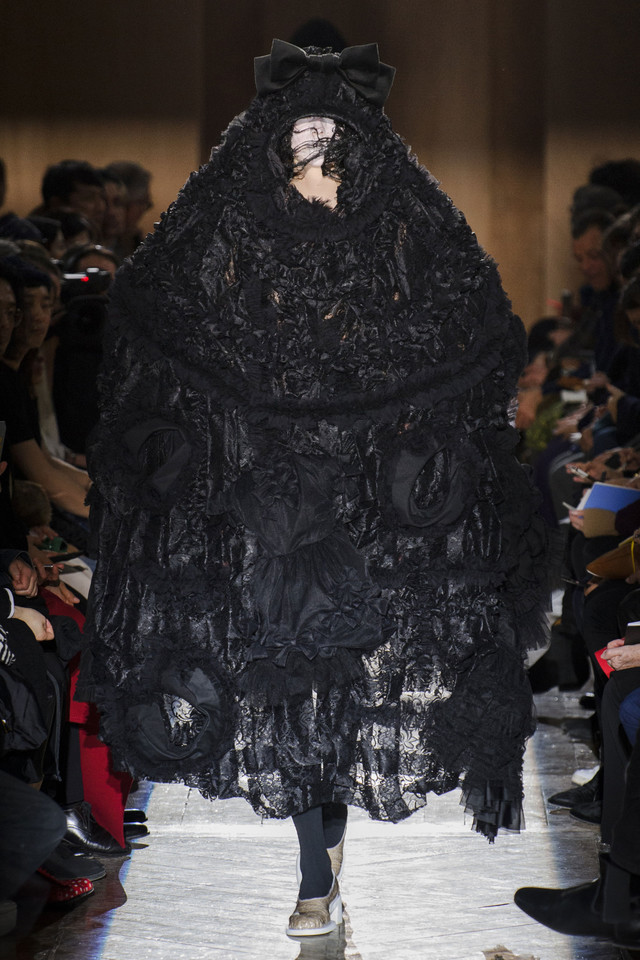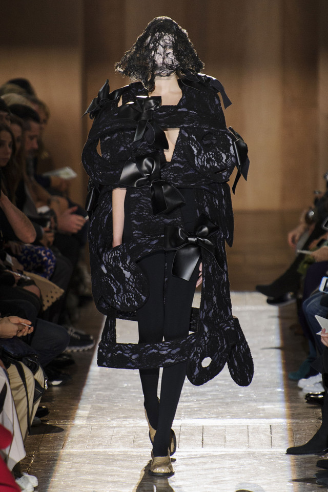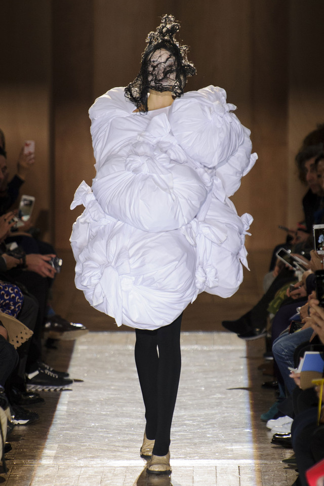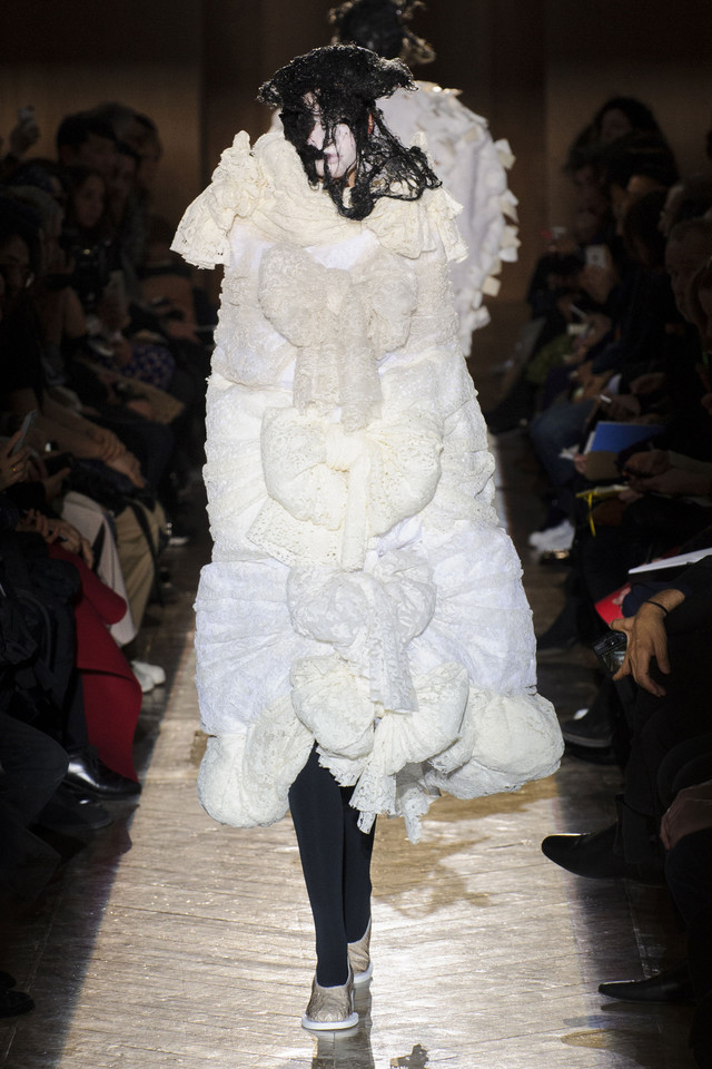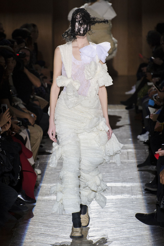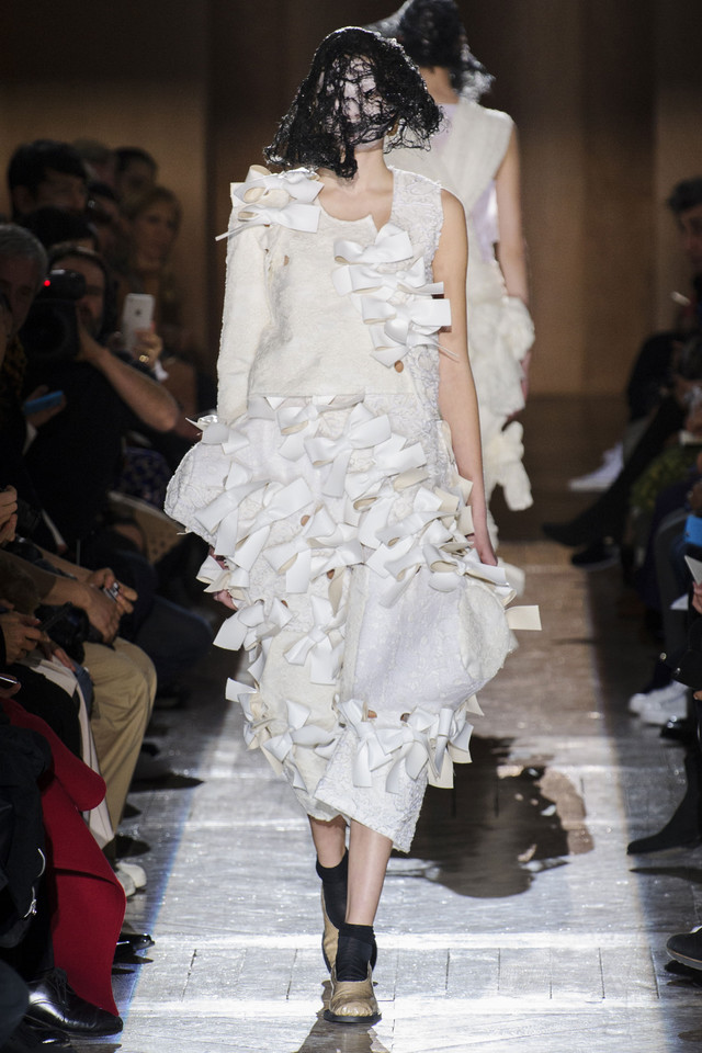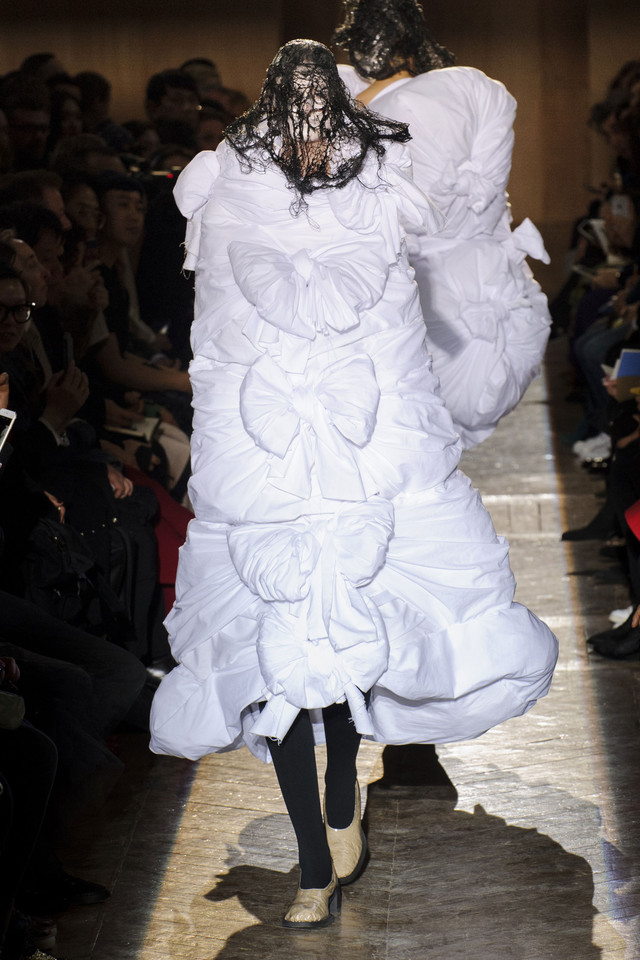 Платья на показах Comme des Garçons, как мы давно уже знаем, превращаются во что угодно — и в стайку огромных черно-серых бабочек, и в странное, но жутко симпатичное подобие хэллоуинского костюма яичницы, и в моток потрепанных бинтов. Точно так же абсолютно все, что окажется угодно душе Рей Кавакубо, может тут же превратиться в платье, будь то коллекция старых абажуров или несколько ящиков, доверху заполненных нарядными белыми бантиками. Любоваться этим можно бесконечно, рассматривая все представленное исключительно как объекты искусства.