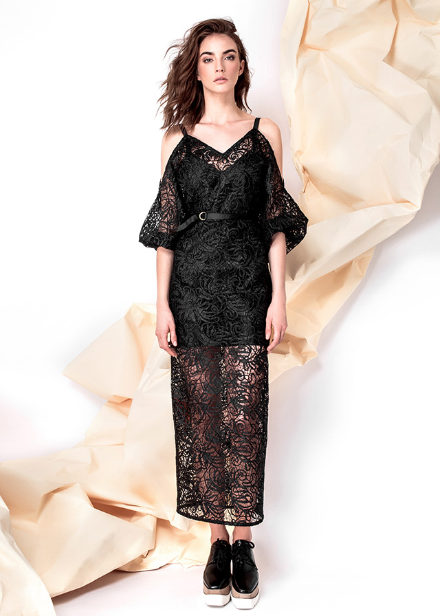 Юлия Калманович в своих коллекциях, как правило, не скупится на детали. Ее вещи украшают то пышные оборки, то ряды пушистых перьев, то вставки с золотым напылением, а то и вовсе чудные меховые помпоны. Однако силуэты всегда остаются предельно простыми, хотя это, благодаря многочисленным отвлекающим маневрам, почти незаметно. Но на этот раз дизайнер решила обойтись без них, представив коллекцию, в которой детали в глаза не бросаются, а, наоборот, от зрителя прячутся. И для того чтобы разглядеть сложность в этих простых, на первый взгляд, вещах, уже придется совершить некоторое усилие. И тогда окажется, например, что черное кружево и не кружево вовсе, а изящное плетение из тонких лент; а кроп-топ, похожий на посыпанный стеклянной крошкой елочный шарик, на самом деле целиком расшит бисером.