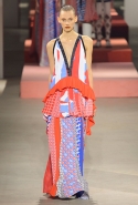 Купальники в большинстве случаев заменили девушкам Kenzo топы, а иногда, видимо, в особенно жаркие дни, и шорты. Они же становятся основой и для множества платьев самого разного кроя и длины от мини до макси. Впрочем, носить слитные купальные костюмы, расстегнув нижние пуговицы, Леон и Лим предлагают и поверх брюк: это сочетание в новом сезоне мы видим уже не в первый раз, так что если у вас в гардеробе до сих пор нет боди, которое можно было бы надевать таким образом, предлагаем задуматься о его приобретении, пока не стало слишком поздно. Вспомнить можно и о вещах в технике пэтчворк: команда Kenzo активно представляет и ее, демонстрируя платья из кусочков пестрых тканей разных расцветок и с разными узорами. А получившееся полотно иногда приправляют и оборками — от этой пышной тенденции следующей весной не скрыться никуда.