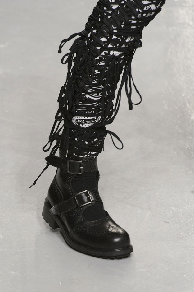 Основные элементы: корсетная шнуровка как элемент стритвер-одежды, свободные края шнуровки и ленты в качестве бахромы, декоративная стежка