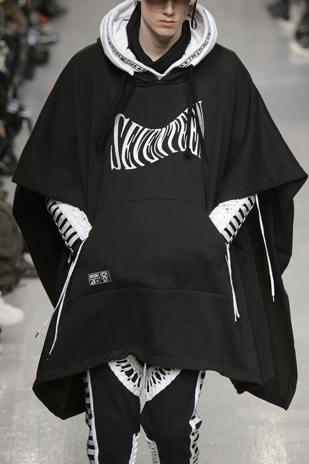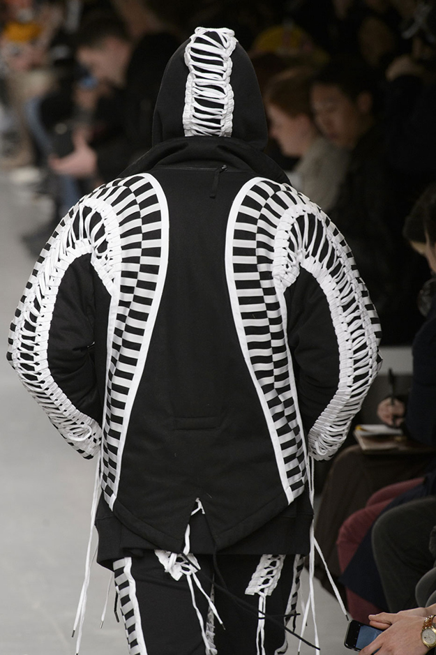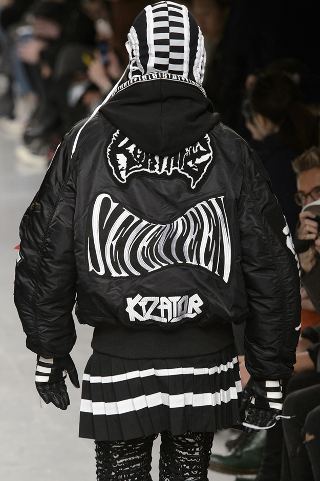 Все характерные признаки дизайна Марьяна Пежоски на месте: черно-белые аппликации, нашивки с загадочными аббревиатурами и охотничьи шапки с ушами.