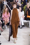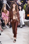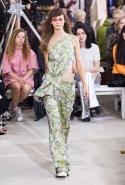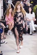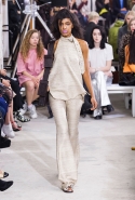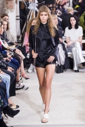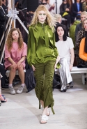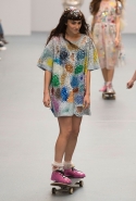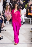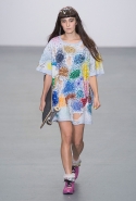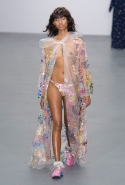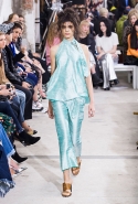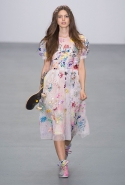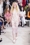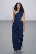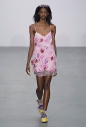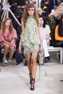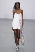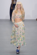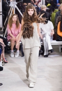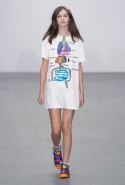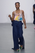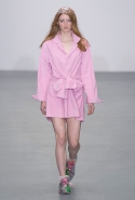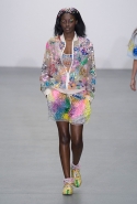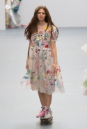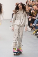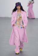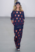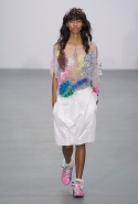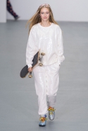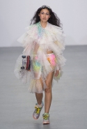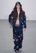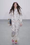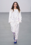 Коллекцию Ashish уже успели растащить на цитаты, и фото с подиума с завидной регулярностью появляются на страницах наших друзей с подписями «А вот так мы с N пойдем на работу» и «А это мы на корпоративе». Самого Ашиша Гупту такое развитие событий вряд ли расстроило: насколько мы помним по нашей с ним встрече (и как видим по всем его коллекциям), с чувством юмора у дизайнера все в порядке. Главным его средством выразительности по-прежнему остаются пайетки. Ими Гупта расшивает платья и спортивные костюмы, а потом еще и сверху посыпает блестками моделей — пестрые конфетти сияют в их растрепанных волосах. На этот раз, правда, преобладают пайетки не ярких цветов и красок из радужного спектра, а, наоборот, светлые, молочного оттенка. Хотя и цветных вкраплений тоже достаточно: мелкие цветы, которыми расшиты джинсовые костюмы и полупрозрачные платья, также собраны из блесток. Но больше всего лично нам запомнились не сияющие выходы, а один-единственный костюм, от ворота до краев брючин исписанный криками о помощи: «Shut up! Shut up! Shut up!»