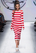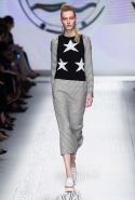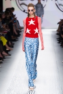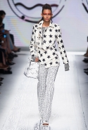 На самом деле основной темой коллекции стала вовсе не Америка, как можно было подумать, глядя на огромные звезды, вывязанные на жилетах и нарисованные на платьях и пальто. Главное увлечение команды MaxMara — море, корабли и моряки. И хотя за звездами и широкими полосами увидеть это с первого взгляда непросто, именно тельняшки и принты в виде иллюминаторов, через которые видно, как плывут по морю корабли и кораблики, играют здесь главную роль. Но стоит заметить это, как очевидными становятся и другие отсылки. Сумки, например, украшают изображения чаек, а главный (не звездный) принт коллекции — белые веревки, закручивающиеся в морские узлы на ярко-синем фоне.