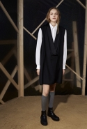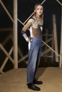 В межсезонной коллекции MM6 всего 24 выхода, зато состоит она сразу из трех разных блоков, каждый из которых вдохновлен разными источниками. Широкие прямые джинсы, которые кажутся мешковатыми, заляпанные брызгами белой краски, чуть сгорбленные спины, ботинки, металлические ожерелья, прикидывающиеся подростковыми "ошейниками" из девяностых, — примерно так выглядят девушки из первой, "сиротской" группы. Есть здесь, например, и гигантская футболка с плеча уж очень крупного мужчины — зато ворот обрезан зубчиками, как салфетка. Отдельная роль в этой части отведена грубому материалу, пробитому по краям металлическими кольцами, — он напоминает парашютную ткань или брезент, и вещи, сшитые из него, держатся на продетых в отверстия нейлоновых шнурах.