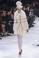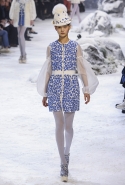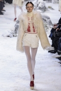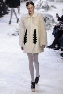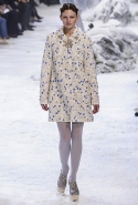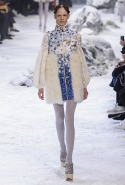 Коллекция, разумеется, продолжает заданную альпийскую высокогорную тему: Джамбаттиста Валли решил в том числе использовать и элементы национального костюма, добавив в линейку расшитые рубахи (точнее, нежнейшие блузы, но с традиционными народными вышивками) и толстые свитера с графичными вывязанными цветами. И те и другие выполнены с той же кутюрной тщательностью, что и все окружающие их предметы, от любимых Валли цветочных платьев с объемным мерцающим декором до теплых пальто с резными белыми узорами и щедрыми меховыми вставками. Выполнена вся коллекция исключительно в сине-белой гамме, так что девушки, даже те, кому достались наряды, усыпанные цветами, походили на юных снежных королевен — как в знаменитой сказке Андерсена, только с сердцами, еще не успевшими превратиться в ледышки. Кому-то из них для полноты эффекта достались также броши в виде снежинок. А на некоторых пальто, которым позавидовала бы даже Снегурочка, красовались искусно отрисованные горные пейзажи.