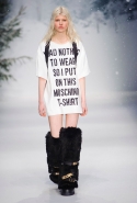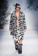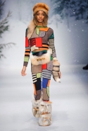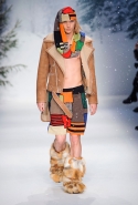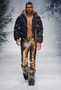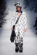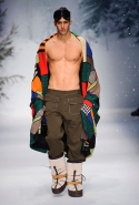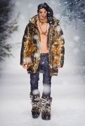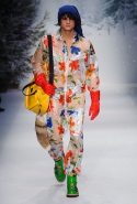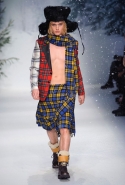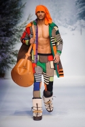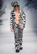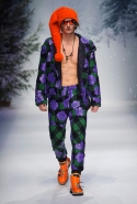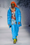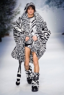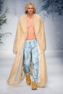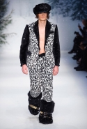 Осенне-зимний мужчина Moschino не боится привлечь внимание: он "соткан" из кислотно-ярких "лоскутов", принтованного меха и лисьих хвостиков. Джереми Скотт создал гибрид эффектного сноубордера, доисторического охотника и абстрактного полотна. Палитра и роскошь почти неприличные: шотландская клетка, пожалуй, самое скромное украшение новой мужской коллекции. Под хлопьями падающего на подиум снега модели вышагивают в "лунных" ботинках, леопардовых шортах из искусственного меха, шубе в пол, "дутых" пуховиках с принтом под деним.