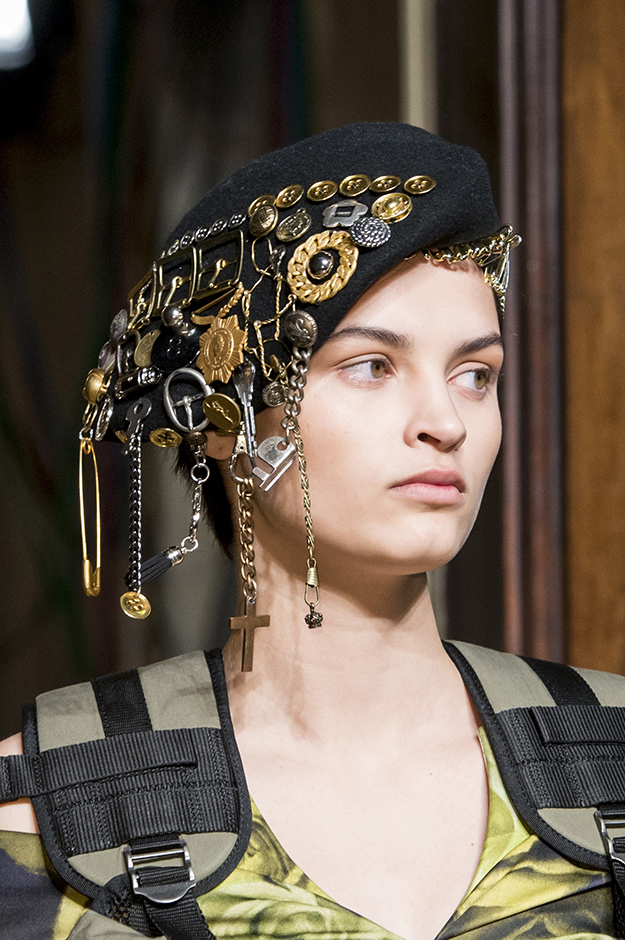 Аксессуары: военные сумки и рюкзаки с камуфляжной расцветкой, военные береты, перчатки и ожерелья, украшенные металлическими деталями
