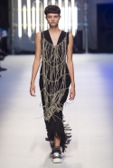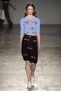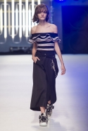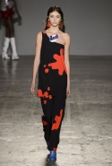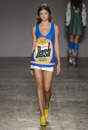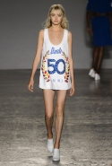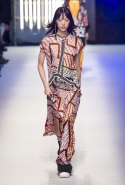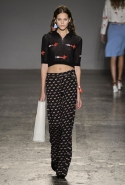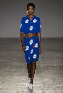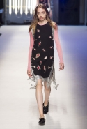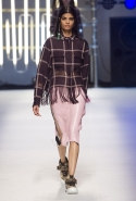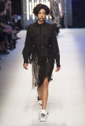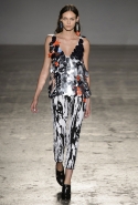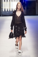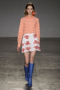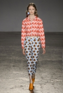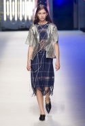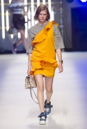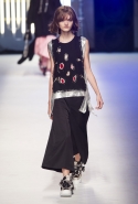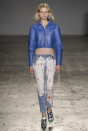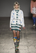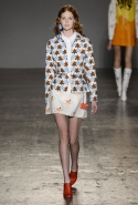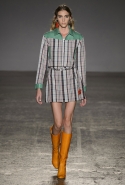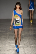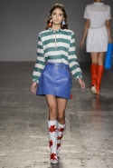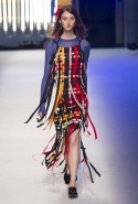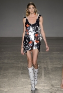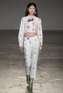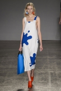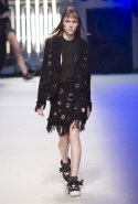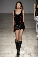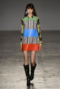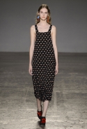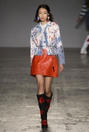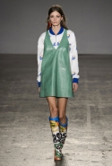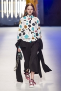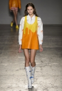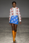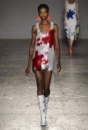 Если у большинства дизайнеров уже начались как минимум 80-е, а то и 90-е, у команды Au Jour Le Jour до сих пор продолжаются 60-е. Со всеми их стандартными признаками: короткими платьями-трапециями, мини-юбками, высокими сапогами и оптическими принтами. Но делают дизайнеры это так весело, что скучать даже из-за надоевшего стиля этого десятилетия не приходится. Кожаные крохотные сарафаны они сшивают из широких полос кожи всех цветов радуги, другие платья забрызгивают пятнами краски, а потом те же пятна повторяют и на нарядах, плотно расшитых пайетками. Появляются у Au Jour Le Jour и новые принты сезона, которые заменят кошачьи и собачьи головы и все рисунки, следовавшие за ними. На этот раз печатают на вещах в основном узоры из мелких клякс, а еще орнаменты из бутылок и почему-то шприцы с лужицами крови.