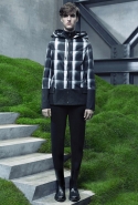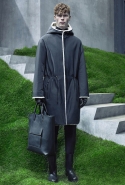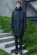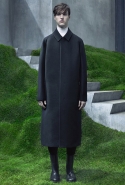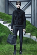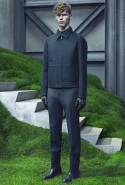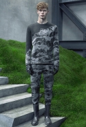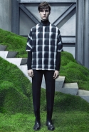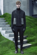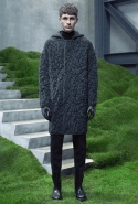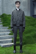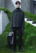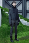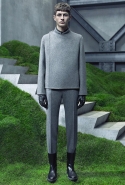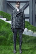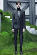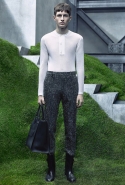 Основную роль в визуальном воплощении этой идеи играют текстуры, вторящие пейзажам на заднем плане: лестницам с острыми углами ступенек, зеленой травой, своей густотой напоминающей мох, и бетонным прямолинейным конструкциям. Александр Ванг, используя материалы, повторяет знакомые текстуры почти в точности. Шерстяные костюмы по фактуре напоминают отшлифованные камни, зернистый пористый узор на свитерах — гранит, а белые отпечатки на сером фоне поддерживают иллюзию того, что очередной пиджак вышел не из швейной мастерской, а из каменоломни. Эффектно смотрится и верхняя одежда из "плюшевого" материала: пальто и жилеты выглядят так, словно на их пошив пошел снятый с камней мох, из зеленого перекрашенный в серый или припудренный серой городской пылью.