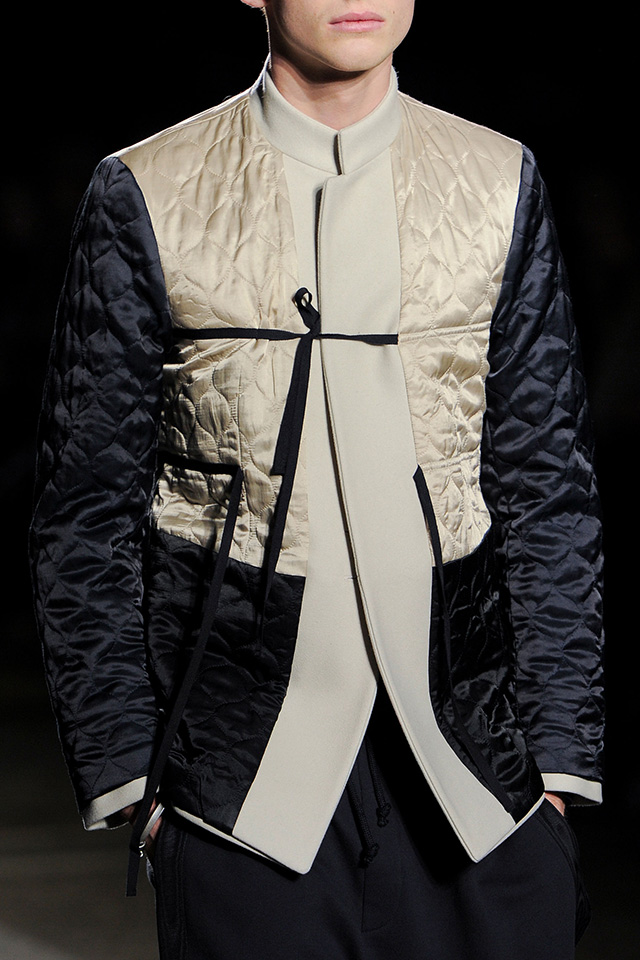 У новой мужской и предыдущей женской коллекций Dries Van Noten много общего, хотя ни о каких цветочных принтах, ярких светлых красках и фестивальных настроениях на вчерашнем показе речи не шло. Им присущ общий расслабленно-свободный дух. Вместо жакетов-мундиров или классических костюмов бельгийский дизайнер предлагает мужчинам атласные пиджаки, похожие на вечерние версии домашних халатов, стеганые тонкие куртки, напоминающие часть восточного костюма, распахнутые (и, опять же, халатного типа) плащи с принтами, словно срисованными с уютных пижам. Вместо брюк со стрелками — узкие брюки, надетые под кюлоты или широкие шорты, вместо поясов и смокингов — асимметричные юбки-фартуки поверх тренировочных штанов. А главным украшением коллекции становится серебряное шитье на клетчатых рабашках, подолах юбок и спинках пальто. Это отсылка к китайскому костюму.