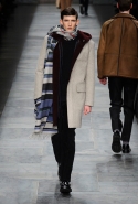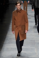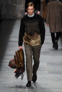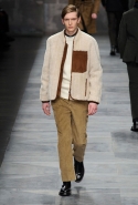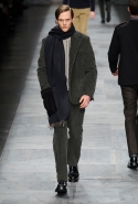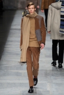 Еще одна из главных мужских тенденций сезона, нашедшая отражение и в этой коллекции, — игра на сочетании в одном образе сразу нескольких текстур. Это и матовая, чуть затертая замша, которая появляется и сама по себе, и вставками на шерстяных пальто; и такой старомодный, но по-своему обаятельный рифленый вельвет, и трикотаж, и кожа, и стриженая овчина. Очень, к слову, хороши свитера с чуть размытыми узорами, созданными с использованием как раз стриженой овчины — мех распознать в затейливом рисунке сначала вообще очень трудно.