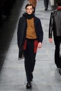 Сильвия Вентурини Фенди выступает за классику, но без всякого официоза: ее герои, как лучшие из итальянских модников, к выбору одежды подходят со всей серьезностью, а к самим себе — с долей здоровой иронии. Поэтому то, что выглядит очень классическим и правильным при ближайшем рассмотрении, — стоит только подойти на пару шагов поближе — окажется совершенно не таким. Многие самые разные вещи, от джемперов до стеганых парок и брюк, с почти кутюрной тщательностью собраны из мелких тканевых деталей, старательно подобранных друг к другу по цвету. Главным графическим элементом в коллекции становится полоска, она появляется буквально повсюду: и снаружи, на очередной версии большого шарфа, представленной на этот раз Fendi, и на верхней одежде, и внутри, прячась под пальто или бомбером. А для одной куртки из тех же цветных полосок мастера итальянского дома собрали портрет талисмана марки — сердитого Fendi Bug c пушистыми треугольными бровками и даже стрижеными меховыми бакенбардами.