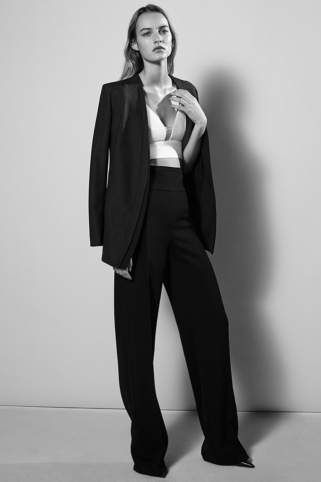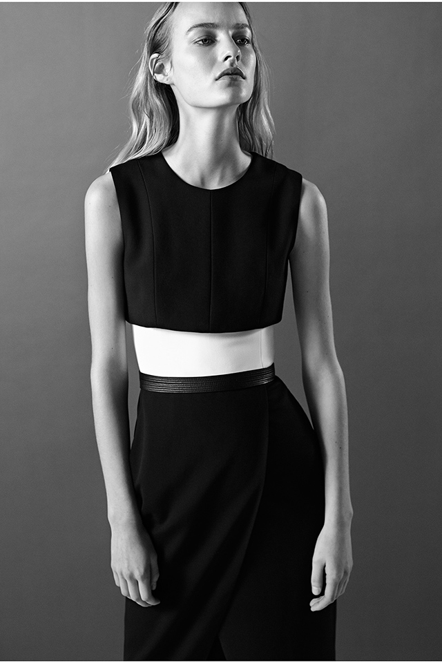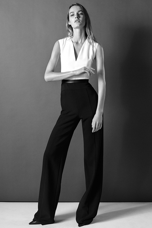 Простые топы без рукавов, единственный кроп-топ, надетый в дополнение к брючному костюму, комбинезон, юбка А-силуэта и несколько обтягивающих платьев — примерно из этих шести вещей дизайнер и собирает образ своей девушки pre-fall 2015. Почти все они черно-белые, но на некоторых красуются волнистые линии-ветки розового и светло-желтого цветов. Все кажется простым, но удивительным, и почти магическим образом приковывает взгляд.