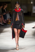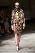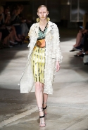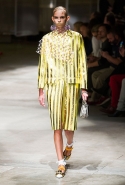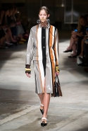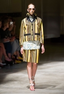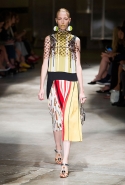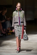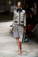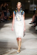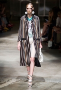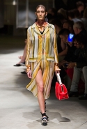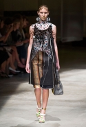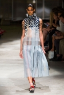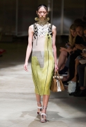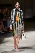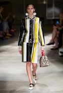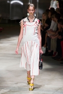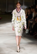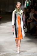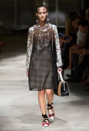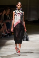 На этот раз Миучча Прада решила не пускать в ход тяжелую артиллерию в виде каких-то запоминающихся принтов, которые часто автоматически превращали каждую вещь из ее коллекций в «вещь сезона». И решила в новом сезоне стать более минималистичной, сделав ставку на простую геометрию. Конечно, без некоторых исключений дело в итоге не обошлось: на плечах порой появлялись сетки с застрявшими в них цветами, ближе к концу другие цветы, уже красные, объемно проросли на красивых белых пальто с лепестковой отделкой, а принты несколько разнообразились — и к двухцветной полоске добавились пестрые сочетания ромбов. Но в целом прямолинейность и некоторая прямоугольность, как будто отсылающая к 90-м, продолжают оставаться главными опознавательными чертами Prada S/S 2016.