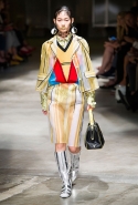 Основными единицами коллекции можно безоговорочно признать пальто и куртки — остальное, включая юбки, сшитые из ткани разной фактуры и в разную клетку, прозрачные костюмы, красиво изрисованные прямыми линиями платья, их только оттеняет. Все куртки, из какого материала они бы ни были сшиты и в какой расцветке, абсолютно одинаковы по форме: они квадратные. А вот заполняет эти квадраты Миучча Прада каждый раз по-новому. Какие-то, серые, с подчеркнутыми кантами швами, похожи на массивные дома — не зря видимые бетонные «швы» между плитами какое-то время считались знаком по-настоящему честной архитектуры. Другие собраны из ярких полос лакированной кожи, третьи прозрачны, а черные линии на них выглядят совсем мультипликационно — как недорисованные контуры одного из персонажей, готовящегося к оживлению на экране.