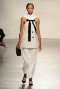 Эта коллекция, несмотря на обилие узнаваемых элементов, действительно не испанская — потому что в ней на самом деле есть все, включая и то, что никак не ожидаешь увидеть в таком окружении. Цыганские оборки могут быть усыпаны красными розами, а могут неожиданно предстать в совершенно ином свете: вот они уже белые, с аккуратной черной каймой, и рукава вместо того, чтобы взрываться объемом, мягко спадают вниз, закрывая кисти. А вместо широких поясов или голых пупков — черные ленты, завязанные скромными, ничуть не торжественными бантами. В одном месте огненные розы мешаются с черно-белым горохом, а следом выходят модели в совершенно японских оригами-жилетах, словно сложенных из бумаги. Вот девушка, похожая не то на тореадора, не то на морячку, в расклешенных и укороченных черных брюках и блузе с широкой оборкой воротника — а вот почти восточный костюм, который могла бы надеть современная реинкарнация принцессы Жасмин, интересуй сказочную принцессу высокая мода.