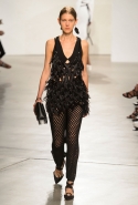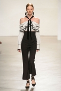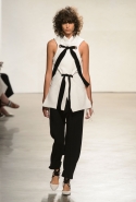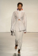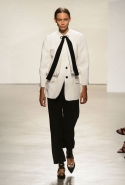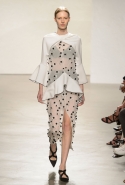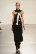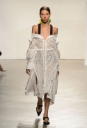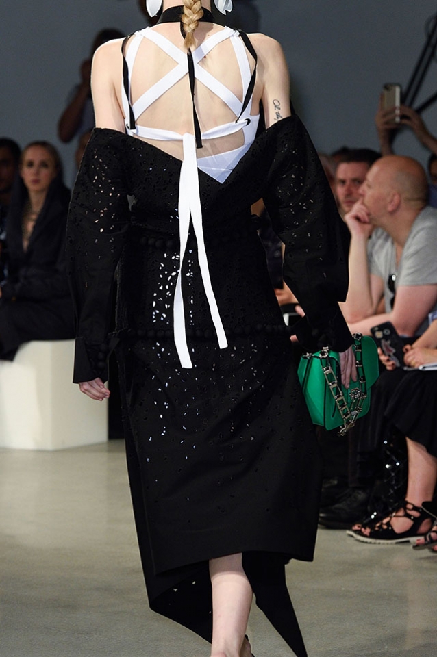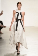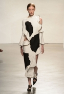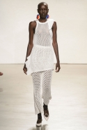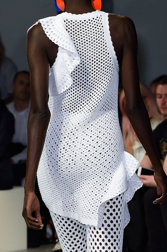 После открытых плеч и оборок начинается самая сложная и самая интересная часть: здесь все то, что мы видели в первой половине шоу, Эрнандес и МакКалоу начинают методично уничтожать, резать, растаскивать на части. Бумажные жилеты расползаются, лацкан с одной стороны скукоживается, превращаясь в странный комок, пуговицы отрываются и повисают печальным рядом вместо того, чтобы степенно удерживать всю эту новую конструкцию в рамках приличий. Сетчатые платья (вот, кстати, самый сложный предмет: обычно стоит им появиться в коллекции, как все тут же превращается в выпускной показ еще одного бунтаря из модной школы) обтягивают тело неравномерно, где-то почти целиком обнажая кожу, где-то только заблюривая.