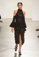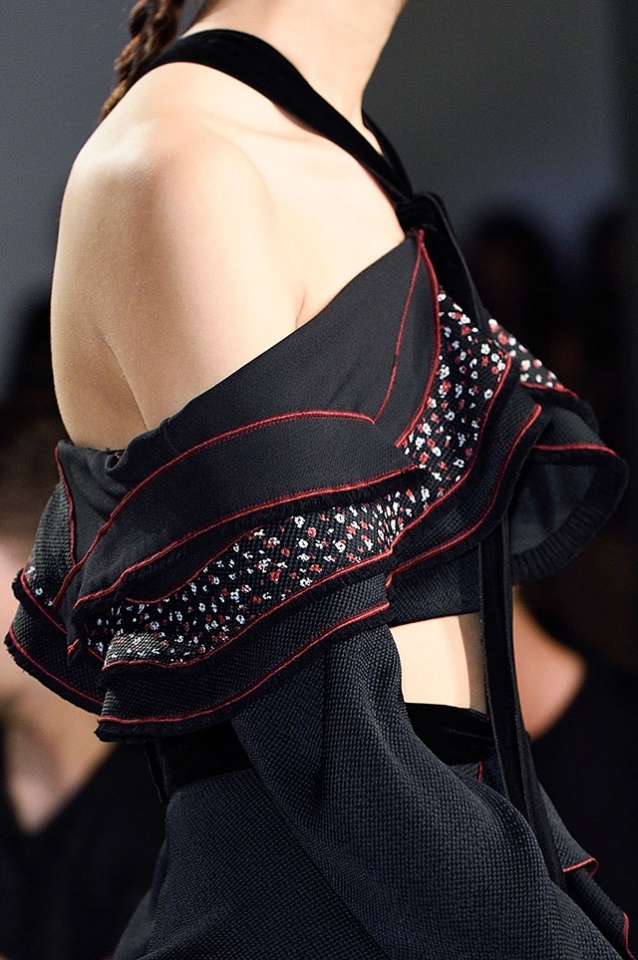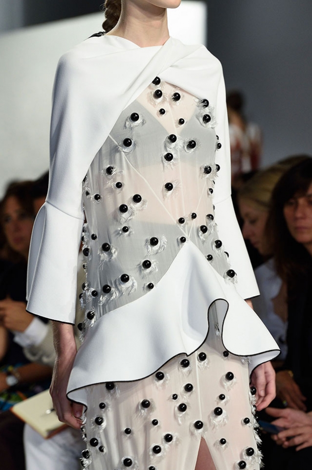 Потом сетки по-птичьи обрастают перьями, оборки собираются вокруг огромных дыр, как вокруг затягивающихся ран, белые вещи покрываются зацепками и мелкими дырками, а на лаконичных пиджаках появляются бусины наростов. И испанская коллекция окончательно перестает быть испанской, становясь деконструктивистской, а черно-красная бойкость уступает место болезненной и мучительной красоте разрушения.