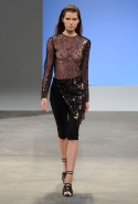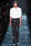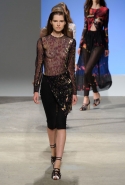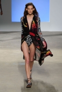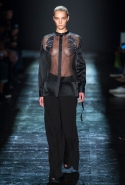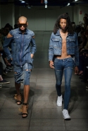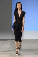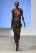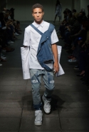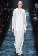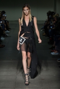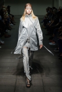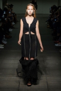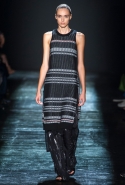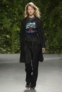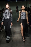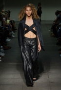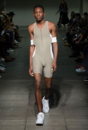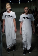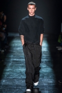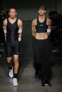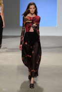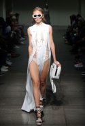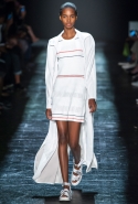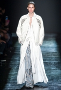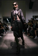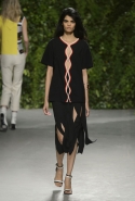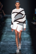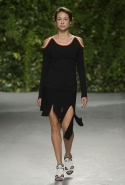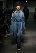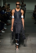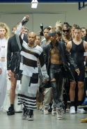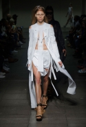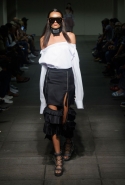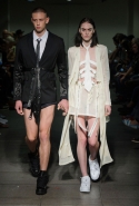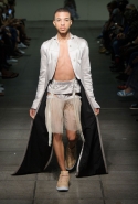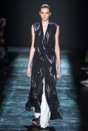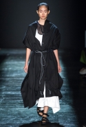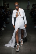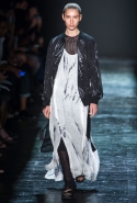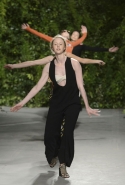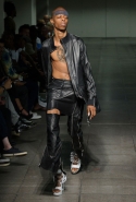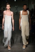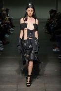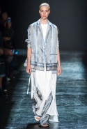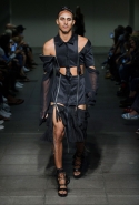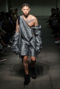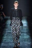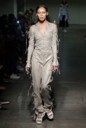 Вещи, подобные этим, обычно ассоциируются с городскими «племенами»: по таким нарядам легко сразу вычислить в толпе «своего». К тому же даже у этого городского кэжуала есть сильные визуальные связи и с этническим, племенным стилем, и с некоторой его воинственностью. Порезанные лапшой юбки, часть которых скреплены сеткой, выглядят не то по-гладиаторски, не то как у вождя племени, готового повести свою группу в бой. Подчеркивают сходство и длинные, почти в пол, плащи, развевающиеся за спинами. Продолжают тему и длинные халаты, испещренные следами зарубок и пятнами, и защитные жилеты, и узоры из крыльев, появляющиеся вдруг ближе к концу, и «ползущий» трикотаж с ритмичными узорами. А о том, что мы все-таки в современном Нью-Йорке, где борьба за выживание ведется уже другими методами, напоминают, например, пижамные штаны, выглядывающие из-под всего этого.