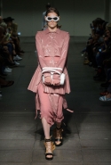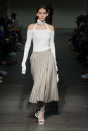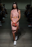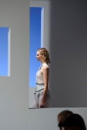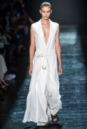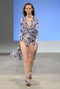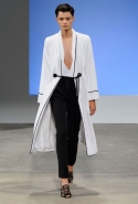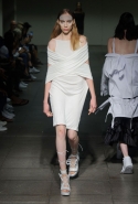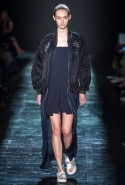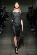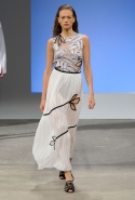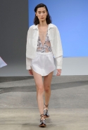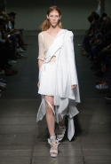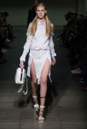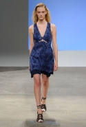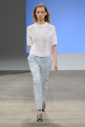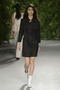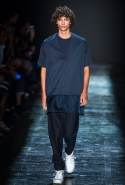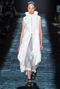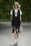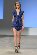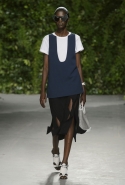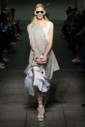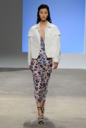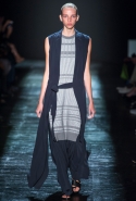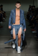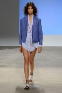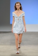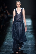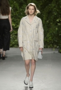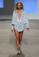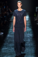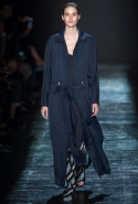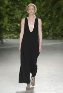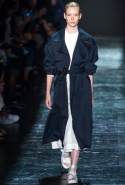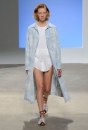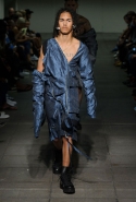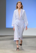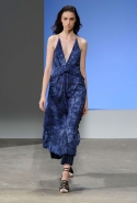 Пока же мы имеем то, что имеем. Первая часть коллекции построена в основном на «вареном» дениме разных оттенков. Что-то выглядит скучно и просто, как в масс-маркете, что-то более интересно — это касается тех случаев, когда дизайнер помимо игры с цветом добавляет еще и разницу фактур, вживляя в платья, например, рифленые полосы. Вторая часть целиком состоит из вещей пижамного стиля или же просто пижам и банных халатов, выполненных даже без особой фантазии и без лоска. В третьей же части появляется несколько красивых платьев, интересных за счет того, что блоки, из которых они составлены, заметно смещены.