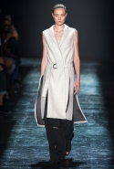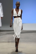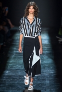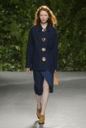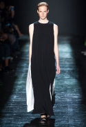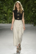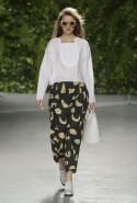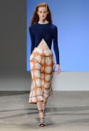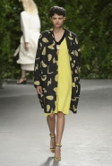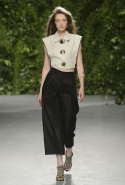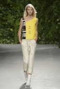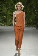 Новая коллекция Умберто Леона и Кэрол Лим вновь напомнила нам, как резкость линий может гармонично сочетаться с плавностью, а светлые, земные тона — с ярко-оранжевым и желтым. Хотя это как раз тот случай, когда слишком крупные пятна цвета кажутся скорее лишними, а уместными становятся, только если используются для расстановки акцентов. Так, например, желтая полоска может выглядеть идеально, если скрепляет ворот, не давая декольте распахнуться и стать почти неприличным. Так же хорошо выглядит и терракотовый топ, на боку у которого красуется блок ткани, расчерченный черными и желтыми линиями. А вот полностью желтое платье или оранжевая куртка с блестящими круглыми пуговицами в таком окружении уже почему-то не работают, слишком выбиваясь на общем фоне и нарушая сложившуюся гармонию.