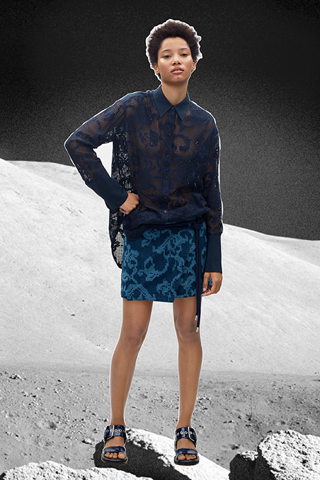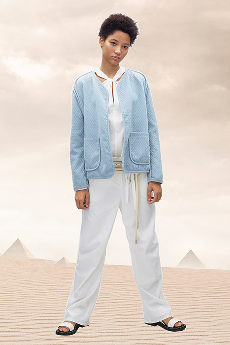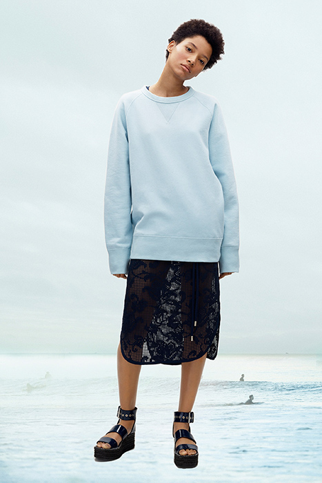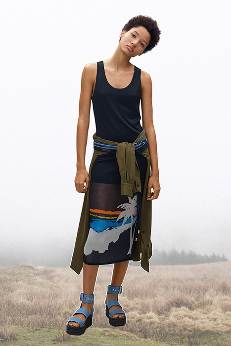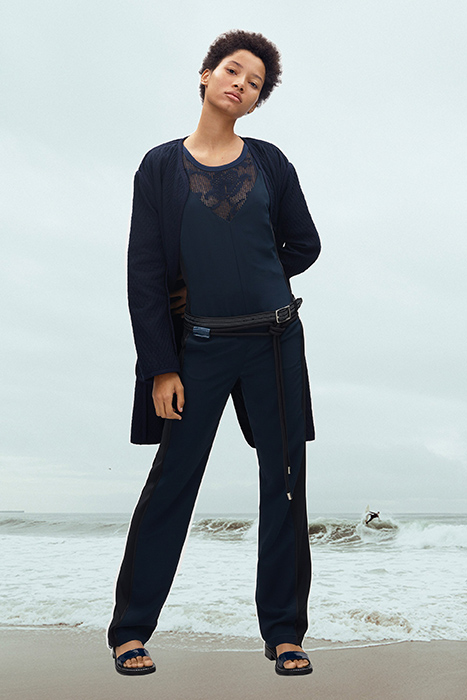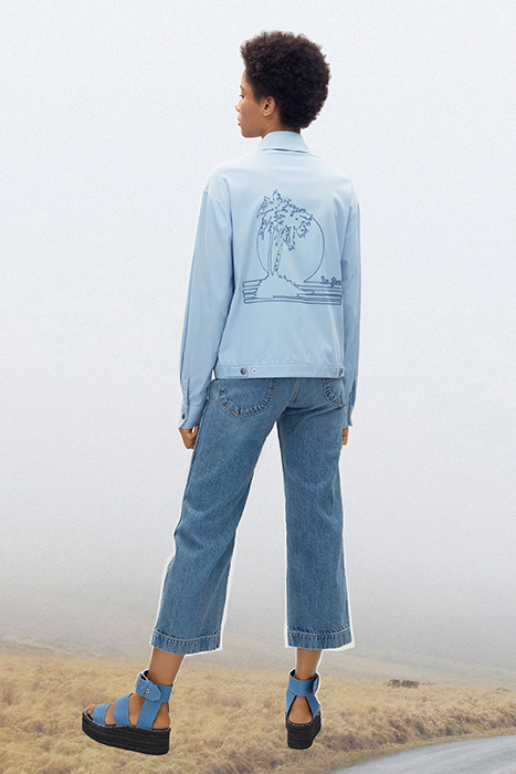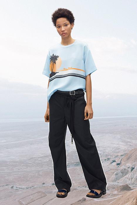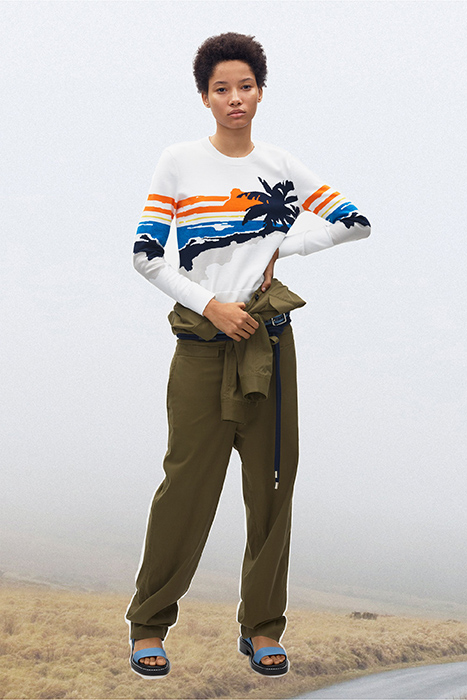 Акцент сделан на комфорт и простоту кроя — получились идеальные базовые вещи для путешествия в теплые страны или для лета в городе. Для жары есть открытые топы и кружевные рубашки, а для прохладных вечеров — свитера и бомберы с рисунком пальмы, джинсовка и свитшот оверсайз. В цветовых сочетаниях тоже все лаконично: белый, кремовый, синий, голубой, приглушенный оранжевый, хаки и черно-белая клетка.