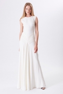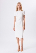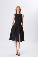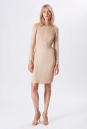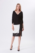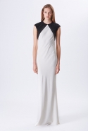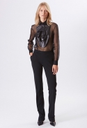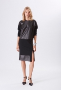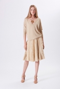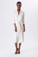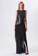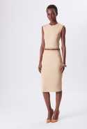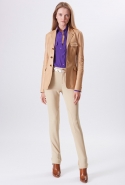 Хотя главными героинями коллекции стали именно эти две воображаемые девушки, саму ее можно разбить на куда большее число блоков. Первой идет самая «ковбойская» часть — с брюками, пончо, куртками и даже рубашками из коричневой замши. Она же постепенно переходит во вторую, уже совершенно городскую и почти не вызывающую никаких ассоциаций с Диким Западом. Здесь в главных ролях спокойные кремовые тона, в которые раскрашиваются вещи, идеально подходящие и для похода в офис, и для неторопливой прогулки по городу: юбки и блузы, брючные костюмы, платья-футляры. Обрывается она блестящим бежевым платьем, после которого начинается графичный черно-белый блок — совсем небольшой. Здесь появляются кожаные вставки, которые заставляют довольно простые вещи казаться чуть более воинственными.