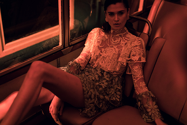 Чувственный образ создается и за счет невесомого шелка и шифона нежнейших молочных и телесных оттенков и приглушенно-розовых пайеток. Большое количество фактурных тканей: сетка, расшитая пайетками, шелковый жаккард, глиттер, металлический шелк, кружево с вышивкой бисером - дополняет архитектурные силуэты, создавая изысканный образ современной Кармен.