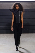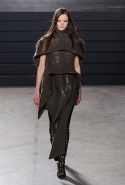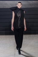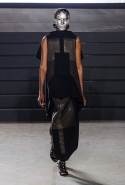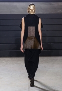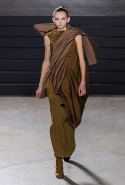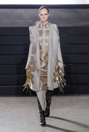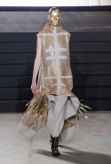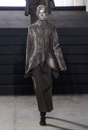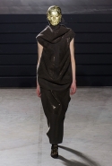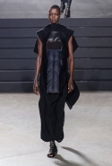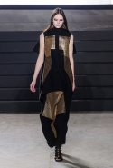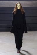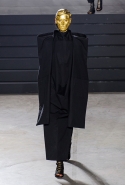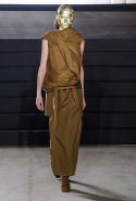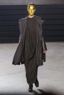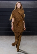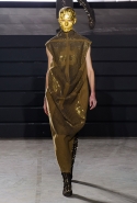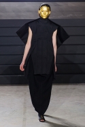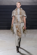 Конечно, фирменный черный цвет не ушел из обихода Рика Оуэнса насовсем, но даже в черном цвете силуэты стали еще мягче и неопределенней, чем прежде. Топы и платья одинаково похожи на обернутые вокруг тела одеяла, брюки широки, а пропорции искажены. Эта коллекция совсем не про воинственность, а про нежность, но и в ней можно обнаружить следы военной атрибутики разных племен. Эта тема находит отражение в графичных узорах из пайеток (с пайетками Оуэнс работает едва ли не впервые в своей карьере — действительно, «сейчас самое время») и в боевой раскраске. Хотя лица моделей, оклеенные золотыми и серебряными лепестками и выкрашенные той же краской, придавали им сходство скорее с ожившими объектами искусства, античными скульптурами, спустившимися с постаментов на улицы.