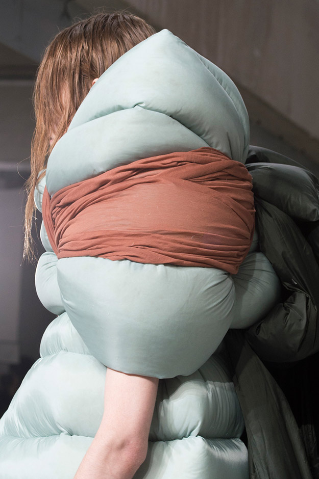 Основные элементы: массивные конструкции из кожи и неопрена, объемные пуховики, большие и мягкие формы
