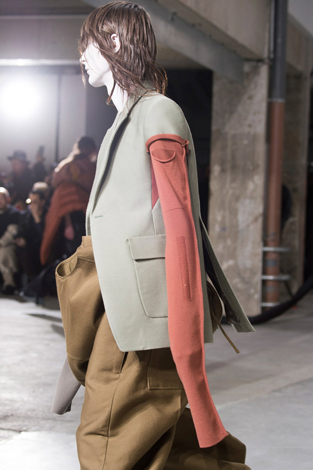 Стайлинговые приемы: спущенные кожаные комбинезоны, удлиненные рукава у верхней одежды, широкие брюки, авангардно замотанные пуховики