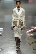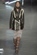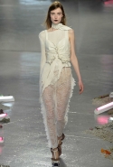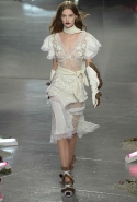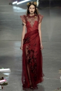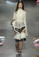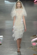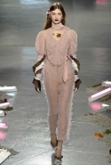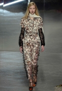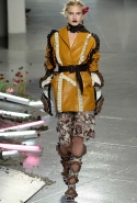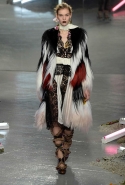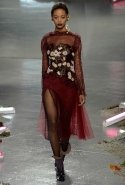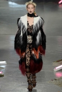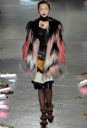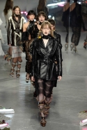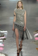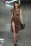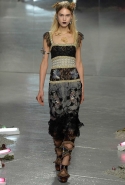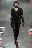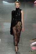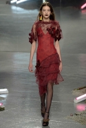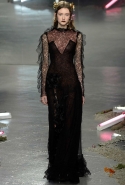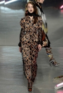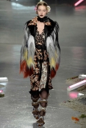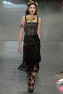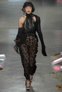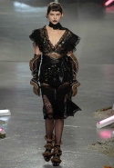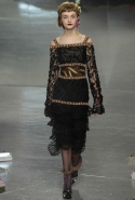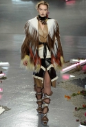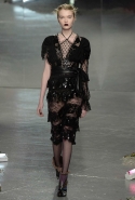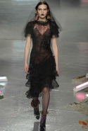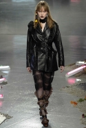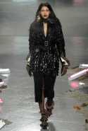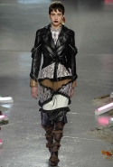 В новом сезоне дизайнеры сохранили свою вечную приверженность обильной отделке и мрачной сказочной театральности, неизменно отличающие все их коллекции. Даже кожа в их руках оказывается материалом не менее пластичным и нежным, чем кружево: тонкие полоски вьются мелкими волнами воланов по собранным из разноцветных блоков юбкам, ползут по округлым объемным плечам жакетов и обвивают, как лианы, высокие перчатки. Так что привычные кожаные косухи теряют свое бунтарское очарование и обретают совсем другое, ранее им не свойственное, превращая длинноногих девушек в загадочных созданий, вышедших из леса.