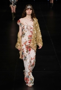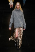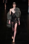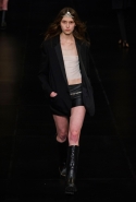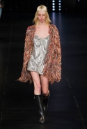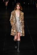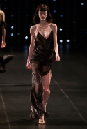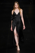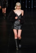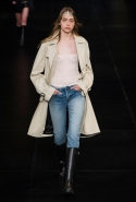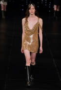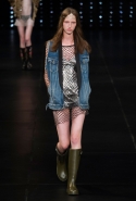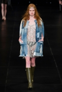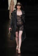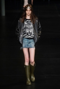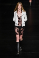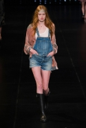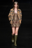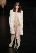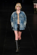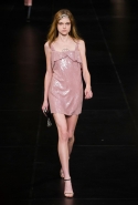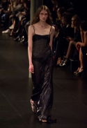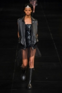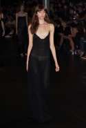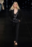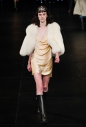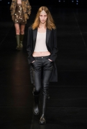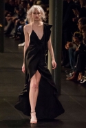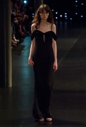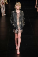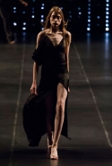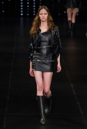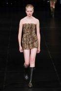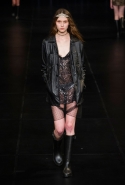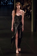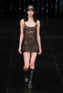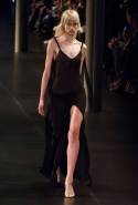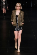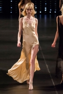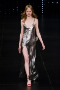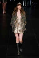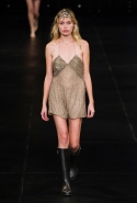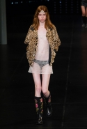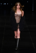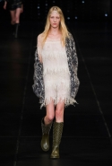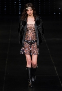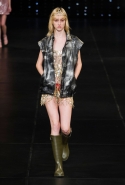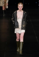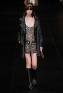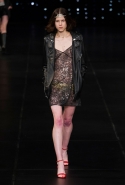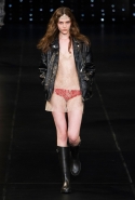 Хотя к этому пора бы уже и привыкнуть, сама идея того, что на шоу Saint Laurent (того самого великого дома! того самого великого Ива!) мы видим куцые комбинации, просвечивающие сквозь них большие трусы и, например, камуфляжные рубашки, по-прежнему может многим претить. Но в таком случае лучше сразу смотреть не фотографии в полный рост, а крупные планы: именно на клоуз-апах становится очевидна вся красота того, что из сезона в сезон делает для марки Эди Слиман. Простые и дешевые вещи, которые можно найти и в Topshop, и на любой барахолке (а этим, по мнению многих, для вдохновения как раз и промышляет сам Слиман), он воспроизводит с искусностью, достойной роскошных кутюрных нарядов. Сорочки собирает из тонких нитей крохотных пайеток, невероятной мерцающей бахромы, удивительной тонкости кружева. Высокие резиновые и кожаные сапоги, выглядящие как простые «хантеры», украшает вышивкой и блестящими заклепками. Из как будто случайно собранных обрезков джинсы шьет потрясающие кейпы, в которых выверены каждая линия и каждый угол. Даже изодранная майка, усыпанная мелкими дырками и зацепками, если посмотреть поближе, оказывается чуть ли не произведением искусства. Что уж говорить о длинных платьях из кожи и кружева, пусть они и сидят даже на моделях криво и кособоко: здесь торчат трусы, сразу понижающие уровень парадности на сто баллов, здесь перекручены лямки и съезжает ткань, как будто случайно обнажая грудь. На то, чтобы художественно воссоздать эту кричащую дешевизну, иллюзию того, что все это просто какие-то вещи, за которыми можно пойти в любой масс-маркет, мастера дома Saint Laurent бросают все свои силы — и это прекрасный ход, который работает.