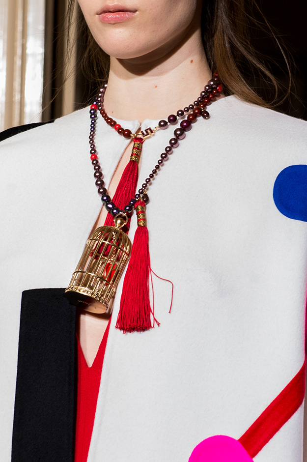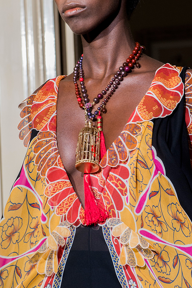 Аксессуары: украшения в виде золотых клеток, маленькие сумки в китайской стилистике, декоративные кисточки, яркая обувь
