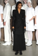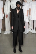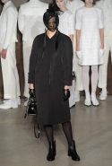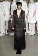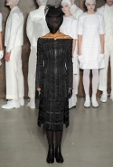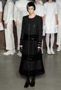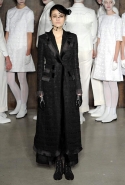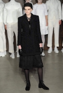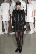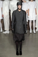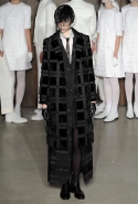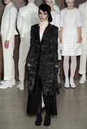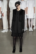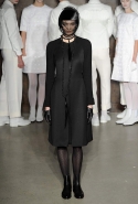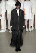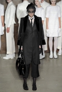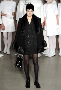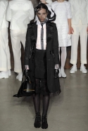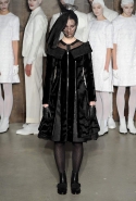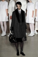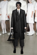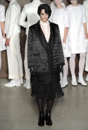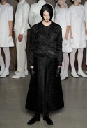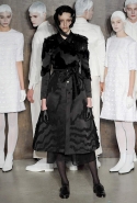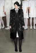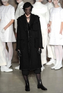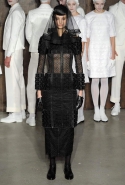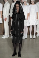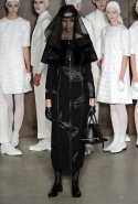 Фоном для основной части показа явилась предшествовавшая ей серия белых выходов: молодые люди и девушки стали и санитарами, и ангелами с вышитыми на спинах курток белоснежными крыльями. Они так и остались в течение всего шоу на подиуме, провожая взглядом всех проплывающих мимо них моделей со скрытыми за темными вуалями лицами — гости один за другим прибывали на собственные похороны. Причиной каждой смерти Том Браун называет не загадочную эпидемию и не катастрофу, а несчастную любовь и, как следствие, разбитое сердце. В жизни нам не приходилось слышать о подобных случаях, но Браун, используя язык моды, так убедительно рассказывает свою историю, что ему поневоле начинаешь верить. А вещи из этой темной сказки, напротив, при ближайшем рассмотрении оказываются совершенно «жизненными» и пригодными вовсе не для исключительно мрачных случаев. Необычные костюмы, скроенные по образу мужских ретронарядов, ставшие одной из главных визитных карточек Брауна, по-викториански богатая отделка, самые неожиданные открытия в мелочах (например, невесть откуда взявшиеся киты, вышитые на атласном жакете) — рассматривать эту коллекцию можно бесконечно.