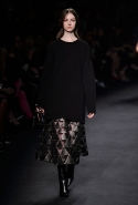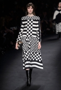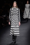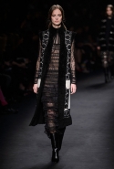 Начинается показ с серии графичных черно-белых выходов. По пальто и платьям разбегаются разных размеров клетки и полосы, свитера складываются из треугольников, а рубашки с топами из прямоугольников и квадратов. Даже аккуратные клатчи, которые держат в руках вышагивающие по подиуму модели, похожи на маленькие шахматные доски. Свое умение работать с белым Пьерпаоло Пиччоли и Мария Грация Кьюри уже доказали, представив свою полностью белую кутюрную коллекцию, теперь настала очередь черного. Total black в руках дизайнерского дуэта оказывается неожиданно богатым и сложным: в игру включаются и кружево, и разные фактуры, и бахрома, и густые замысловатые вышивки, и блестящие камни. А минималистичные и максимально лаконичные образы становятся интереснее за счет белой обводки всех видимых швов. Добавляется к черно-белому царству и климтовская палитра: узорчатые шубы и длинные платья, расписанные золотом и нарядными растительными орнаментами, и сами по себе похожи на произведения искусства.