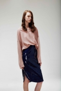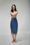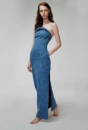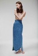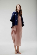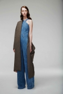 Интересной вышла и джинсовая часть коллекции, первая в истории марки и вдохновленная, по словам Вардуи, как раз снимком ее младшей сестры в саду дома в Гюмри. Мы уже привыкли к тому, что деним может послужить материалом для совершенно любой вещи, а джинсовый комбинезон вовсе не обязательно будет похож на те, с широкими лямками, что мы носили в детстве. Но и здесь дизайнеру удается приятно всех удивить. Деним может собираться в валик на корсаже платье, как бывает только у нарядов совсем вечерних, может обрезаться уголками и накладываться слой за слоем. Интересно Вардуи Назарян объясняет и то, почему джинсовые юбки в ее коллекции постепенно укорачиваются от пола до мини: это, как она поясняет, отсылка к квадратам в перспективе на картине Роберта Ирвина.