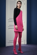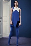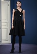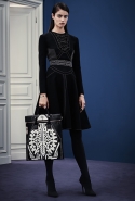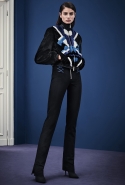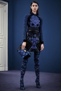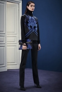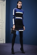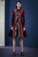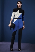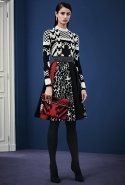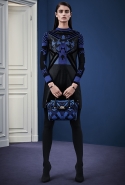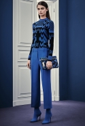 В расхожем представлении итальянское межсезонье должно быть неизменно теплым и солнечным. Донателла Версаче пошла вразрез с шаблоном, создав сдержанную, облеченную в преимущественно темные цвета коллекцию, почти скандинавскую по духу. Одним из главных украшений джемперов, платьев и юбок стал графичный сине-черный принт, напоминающий ледяные кристаллы и снежинки. Он то скромно располагается на груди, то изморозью расползается по всему образу: по рукавам, юбке, клатчу и даже колготкам. Другие принты Донателла дала более широкими мазками в духе геометричной абстракции — они украшают брючный костюм, красно-синее платье с коротким рукавом.