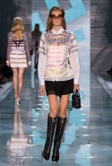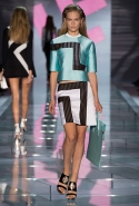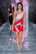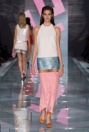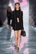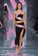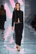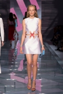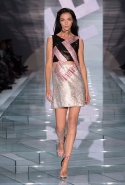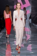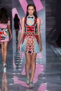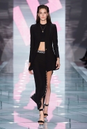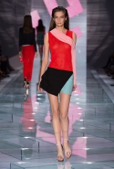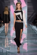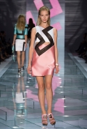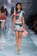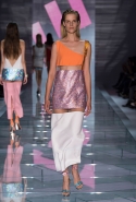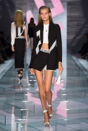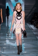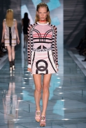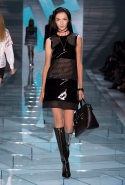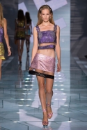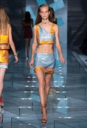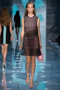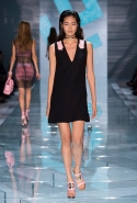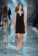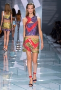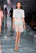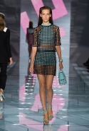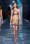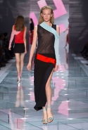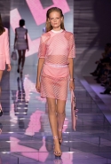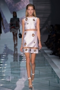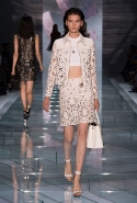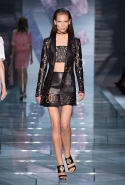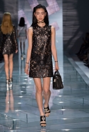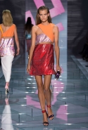Отважная, новая и свежая — так описала коллекцию сама Донателла Версаче, появившись перед журналистами. Поначалу, по крайней мере всю первую половину шоу, ничего особенно "нового" в глаза не бросается. Наоборот, можно подумать, что после осенне-зимней коллекции, которая своей элегантностью действительно выбивалась из ряда всех предыдущих, хозяйка модного дома снова взялась за старое. Но за несколькими костюмами и асимметричными платьями действительно последовали самые короткие юбки сезона с надетыми поверх перфорированными платьями-сетками. Снова сквозь прорези на ткани мелькает голое тело — не только подтянутые модельные животы или ноги, но и вообще любые участки, которые приходятся на вырезанные из ткани кружки, которые остались ничем не заполненными.