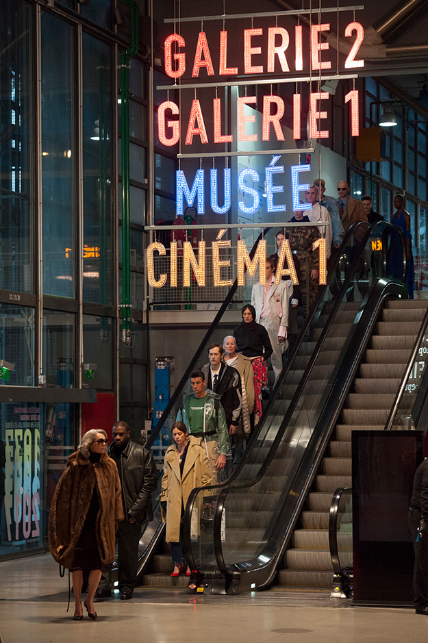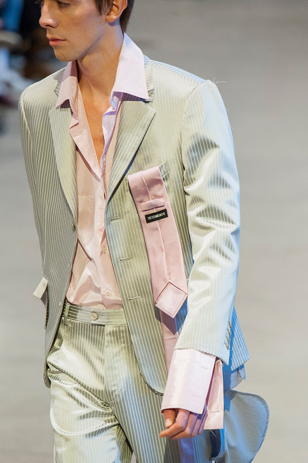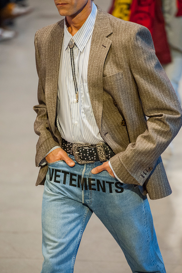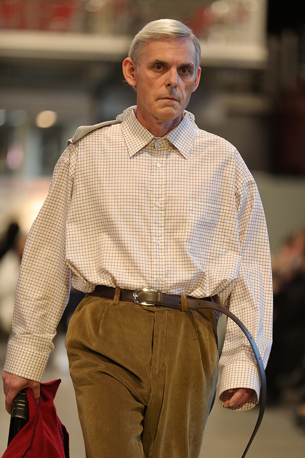Описывать каждую модель не имеет смысла: это те люди, которых можно увидеть на любой улице среднестатистического европейского города. Более неоднородной коллекции мир еще не видел. Таков замысел, но Vetements были бы не Vetements, если бы не подсунули в каждую модель какую-никакую, а хитрую свинью. Солдат НАТО в военной униформе носит на спине слоган «Он просто солдатик, он ни в чем не виноват», длинноволосый металлист одет в квадратную оверсайз джинсовую жилетку (невольно представляешь в ней Канье Уэста), а в роли офисной леди, спешащей по делам, выступила стилист Vetements Лотта Волкова.