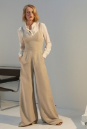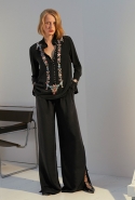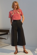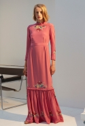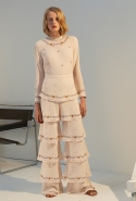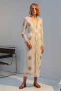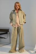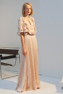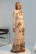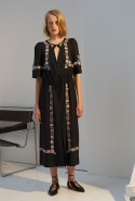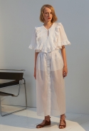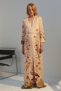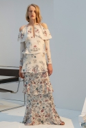 На этот раз Вильшенко и ее команда выходят за рамки привычного набора вещей, непременно присутствующего в каждой коллекции. Воздушные платья, нежные блузки с оборками-крыльями на рукавах, расшитые жакеты и сорочки — все здесь. И все сделано так же хорошо, как и всегда. Но кроме них в коллекции можно найти и свободные широкие-преширокие брюки, и комплекты с необычными «клешами», и расслабленные комбинезоны. А еще костюм, похожий на униформу маляра: «немаркого» земляного цвета, «палаточного» силуэта, мешковатый и просторный — что для Vilshenko уж точно совсем не традиционно. При этом рядом с ним совершенно гармонично, ничуть не выбиваясь из общей картины, смотрятся вещи, буквально собранные из оборок и сдержанно пышных рюш.