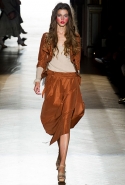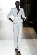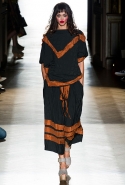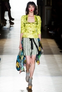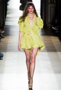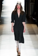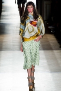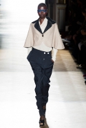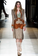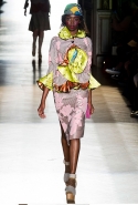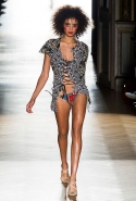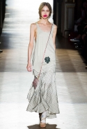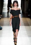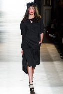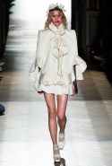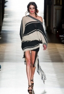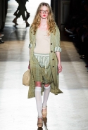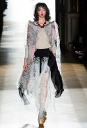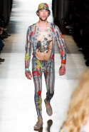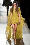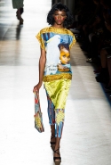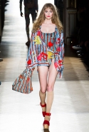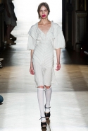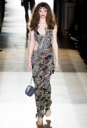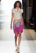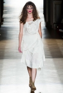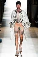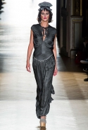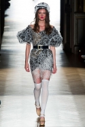 Он же, но уже в черно-белом варианте перекочевал и в весенне-летнюю коллекцию Vivienne Westwood Gold Label. Цензурирующий листок мы обнаружили на нижней части такого же телесного цвета бикини — и на вечернем молочно-бежевом платье. В остальном же коллекция далеко не так минималистична: другие наряды похожи на маскарадные костюмы, но уже после того, как гости оттанцевали в них всю ночь и поутру возвращаются домой. Помада на их губах размазалась уже и по лицу, волосы взъерошены, рубашки, кажется, в пылу танцев лишились большей части пуговиц. Атласный камзол с отделкой из кружева накинут прямо на домашние леггинсы — кажется, кто-то после бала уже начал постепенно превращаться в тыкву.