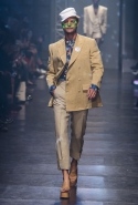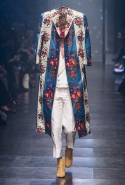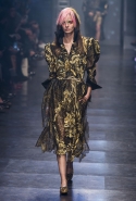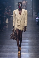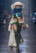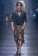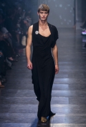 Интересно, что самые спорные наряды достаются как раз моделям-юношам — их дизайнер одевает в обтягивающие комбинезоны и платья, в сооружения из сетки, украшенной пастельными лепестками, красные тоги с драпировками. Не скупится Вествуд, берясь за мужчин, на бижутерию и макияж. А больше всех достается Бену Аллену: он примеряет сразу и полосатые лосины придворного шута, и смешные двухцветные сапожки, и пышный воротник. А потом и вовсе выходит на подиум в одном из самых впечатляющих, несмотря на свой черный цвет, платьев всего показа. Так выглядит гендерная амбивалентность по-венециански — хотя на карнавалах костюм и пол его носителя напрямую связаны не всегда.