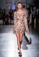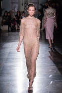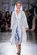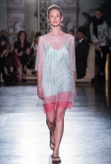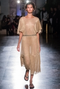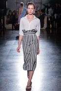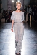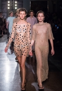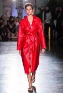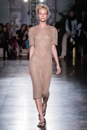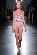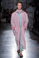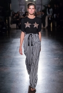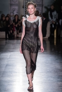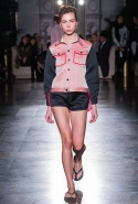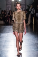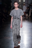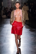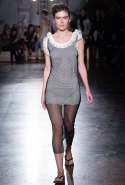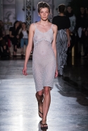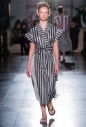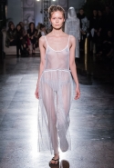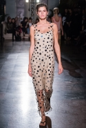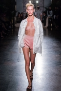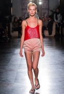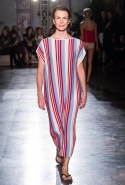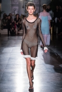 Жажда денег и приключений в этой коллекции сливается с отпускной беззаботностью. Так что пляжные вещи в полоску, которые здесь представлены во всем многообразии, от комбинезонов с широкими брючинами до длинных туник, соседствуют с совершенно другими вещами. Например, с многочисленными платьями-комбинациями. Или с ярко-красными лаковыми шортами и плащами-халатами, под которыми может что-то быть, а может и нет. Или с теми самыми платьями из сетки, некоторые из которых еще и усыпаны мелкими кружками, напоминающими монетки. Те же кружки закрывают соски модели, когда на груди у той вдруг распахивается пушистый и в остальном довольно скромный на вид кардиган. Случайность или нет? Мы, конечно, склоняемся ко второму.