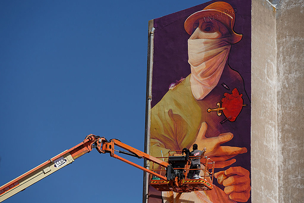 Прически и макияж: головы и лица моделей скрыты яркими платками и головными уборами, глаза подведены ярким карандашом